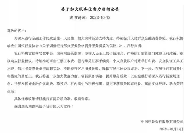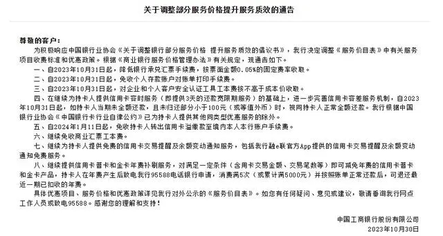 农行公告指出,自2023年10月31日起,继续为持卡人提供免费的信用卡交易提醒及余额变动通知服务;免收持卡人转出信用卡溢缴款至境内本人本行账户手续费;继续提供信用卡普卡和金卡年费补刷机制;继续提供信用卡容时、容差服务机制。