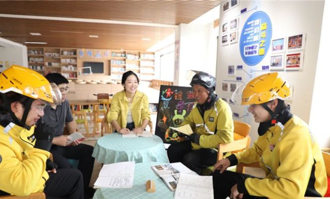 节假日是外卖骑手最忙的时候。老谢咋还愿花时间“管闲事”?老谢搓了搓手上的薄茧,嘿嘿一乐,满脸骄傲:“咱不单单是骑手,社区把我们纳入‘共治合伙人’队伍,咱也得成为社区的‘马大姐’嘛。” 说着话,老谢掏出手机,点开一张照片:只见他和几名骑友围坐在韩乐坊社区暖“新”蜂巢驿站的桌子旁聊天、歇脚,手机则插在插座上充着电,满是惬意。 “以前哪有这好地方?”他顿了顿说,每天下午2点到4点,算是骑手们的“空单期”。而驿站投入使用前,大伙只能找片阴凉地,靠在车旁将就休息,身上还得时常揣着充电宝。 “简陋”的工作环境,曾一度让大伙有种落不下脚的“漂泊感”。“有段时间,站点里固定骑手还不到30人,兼职骑手的‘换岗率’更高。”老谢回忆。为了“留住人”,站点所在的韩乐坊社区下了番工夫:把党群服务中心、网格驿站、沿街商铺等资源整合起来,建设成供大伙歇脚、避暑、饮水、充电的暖“新”驿站。