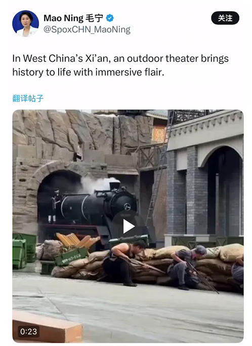 近日,中国外交部发言人毛宁通过其海外社交平台,发帖推荐华夏文旅西安度假区大型户外战争实景演艺《古城烽火》秀精彩视频,并配文高度赞誉。