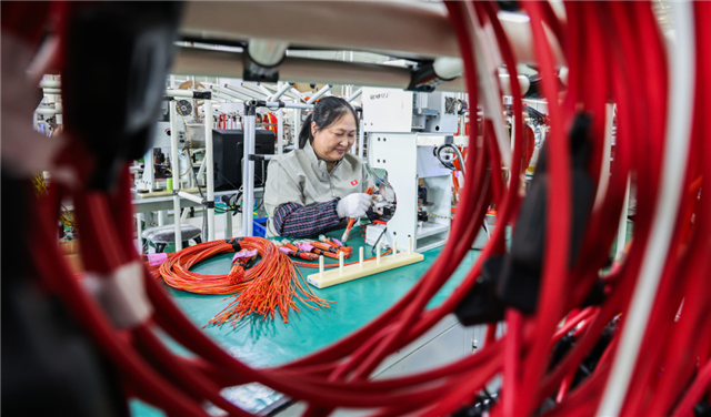 在公司一楼生产车间,自动裁断压接机、喷码裁断压接机、自动防水塞裁线机等29台自动化设备有序运转,绿色运行灯与红色警示灯交替闪烁,实时反馈裁线、压接、线束热缩等各环节生产进度。智能制造管理平台的大屏上,9条流水线的生产任务、完成进度及质量预警数据一目了然,实现生产全流程可视化管控与无纸化办公。“通过数字化赋能,公司整体生产与办公效率提升了10%。”公司设备主管赵培斌说道。