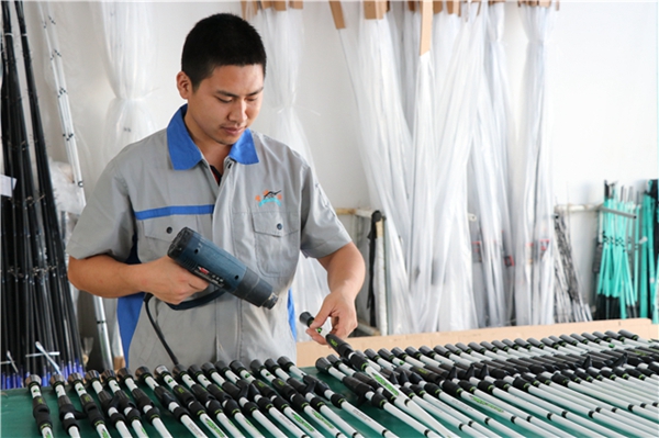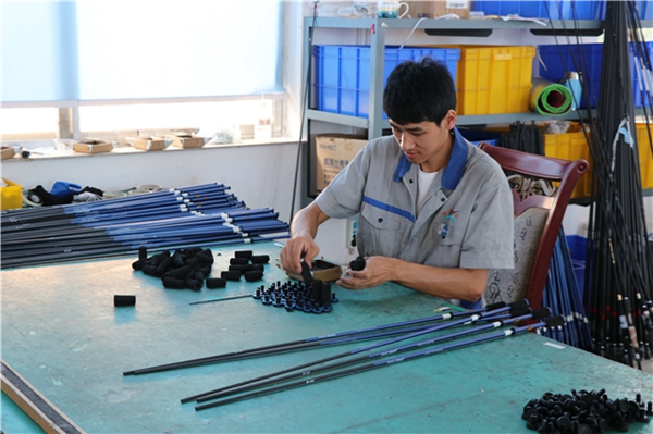 工作人员正在制作鱼竿配件