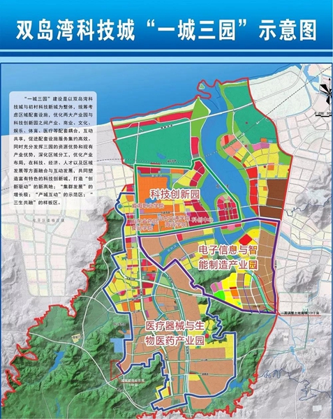 2017年高新区管委提出打造“一城三园”工程,“一城”,即63平方公里的双岛湾科技城;“三园”即科技城内10平方公里的科技创新园、18平方公里的医疗器械与生物医药产业园、10平方公里的电子信息与智能制造产业园。“三园”的中心工作就是打造一个国家区域创新中心和两个千亿级产业园。“一城三园”统筹考虑产业、商业、文化、娱乐、体育、医疗等配套设施,在科技、经济、人才等方面融合互动,园区各自聚焦资源优势和产业优势,实施专业化、差异化、集群化发展,打造创新驱动的新高地,集群发展的增长极,产城互动的示范区,三生共融的样板区。