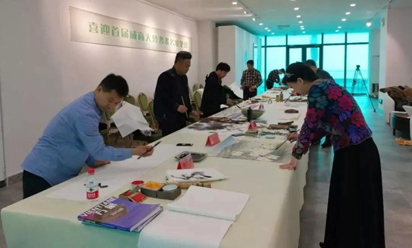 4月9日,海角小镇艺术海湾会议室内,参加“喜迎首届威商大会书画名家笔会”的9位书画家会员现场创作书画作品百余幅。这是市党外文化艺术工作者联谊会对威商大会的献礼。联谊会负责人说,这些作品将全部捐赠给威商大会,作为喜迎威商大会顺利召开的一份特殊“献礼”。