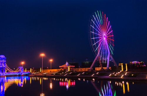 位于花街南侧的英伦蓝桥,夜晚正是展现它高颜值的最佳时机,整个桥体呈现出梦幻般的蓝色,引得不少游客前来打卡拍照。旁边是最近建成的摩天轮和旋转木马,随着光与色彩的瞬时变换,童话的浪漫感油然而生。夜色正好,月亮高悬,不知道多少红男绿女在这里互诉衷肠。