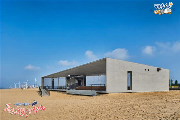 在沙滩上,伫立着两座风格鲜明、极具现代艺术气息的建筑,神秘又诗意,取名“守望者”,寓意大海的守望者,沙滩西侧的是“守望者一号”,东侧则是“守望者二号”,二者遥遥相望,共护大海。
