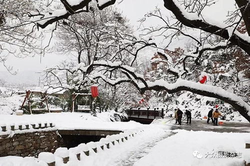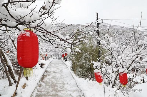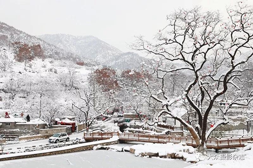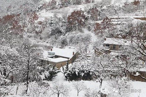落了雪的里口山,树木,房舍,道路,皆为雪白,如梦,如幻。