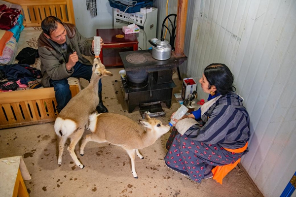 肉保、德措吉夫妇在照顾两只藏原羚。 宋林继摄