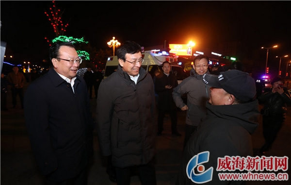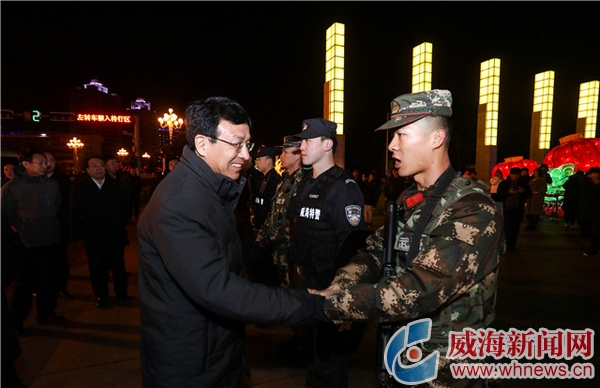 幸福门广场上,欢歌笑语、喜气洋洋。为确保周边区域安全有序,特巡警支队与武警支队官兵正驻扎一线、严阵以待,王鲁明与大家一一握手,对大家维护城市安全付出的努力表示感谢,要求相关单位科学调配力量,合理安排调休。今年春节是威海禁放烟花爆竹后的第一个春节,王鲁明同在场市民面对面交流,认真询问禁放烟花爆竹的感受。“既环保,又安全,我们赞成!”听到大家积极响应,王鲁明十分欣慰,叮嘱大家做好宣传发动,共同过一个绿色安全文明的春节。
