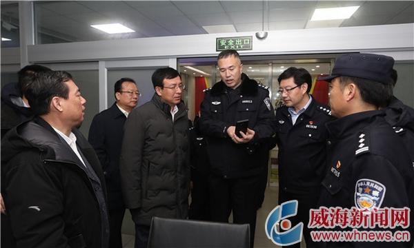 慰问途中,王鲁明偶遇正在巡逻的红袖标志愿警。当了解到节日期间,经区共安排了千余名红袖标志愿警开展治安巡逻等工作,每幢居民楼都有专人巡查值守时,王鲁明向坚守岗位的民警、社区工作人员、志愿义工等表示感谢,高度肯定了他们为保威海安宁甘当城市守夜人的奉献精神。王鲁明动情地说,“春节是一年中最重要的团聚节日,在这样的日子里你们不能与家人团聚,大家辛苦了,给你们拜年了!”随后,王鲁明来到经区皇冠派出所、环翠区竹岛街道文昌社区恩雨警务室、高区古寨派出所,查看了勤务指挥室,详细询问节日期间值班力量、接处警、社会面防控力量部署情况。通过LTE移动终端设备,王鲁明与正在社区执勤的民警进行交流,为大家送上新春祝福。