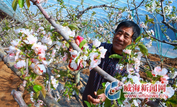 威海新闻网2月20日讯(记者 朱春晓)2月17日,在临港区神山家庭农场的樱桃大棚内,“葡萄大王”曹玉波正在为“美早”大樱桃人工授粉。
