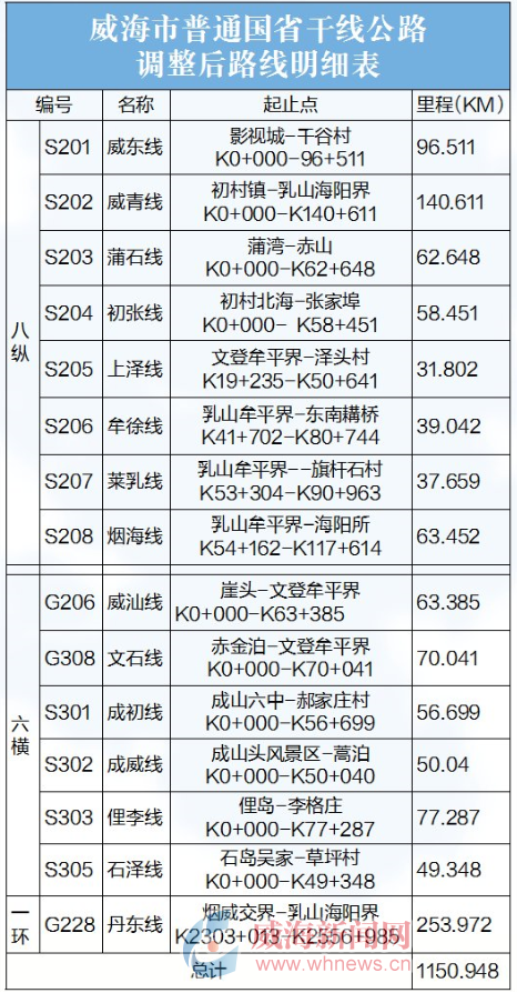 工作人员表示,根据今年路网调整升级改造要求,G18荣乌高速、G1813威青高速、S11烟海高速,里程不变。普通国省道调整后的通车里程1150.948公里。国道由原来的1条增至G206威汕线、G308文石线、G228丹东线3条,共387.398公里;省道12条,分别为S201威东线、S202威青线、S203蒲石线、S204初张线、S205上泽线、S206牟徐线、S207莱乳线、S208烟海线、S301成初线、S302成威线、S303俚李线、S305石泽线,共763.55公里。