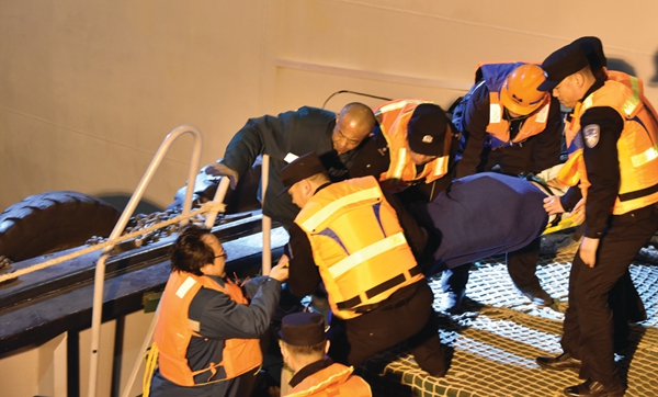 出海时间定在18点左右。出海船只安排妥当后,威海出入境边防检查站拨打120说明情况,120急救中心就近安排威海市立三院组织医护人员随船出海营救。17时37分,载有3名医护人员的急救车快速驶向威海三进船厂码头。18点15分,来自威海出入境边防检查站的6名民警、威海市立三院3名医护人员和急救车司机,登上拖轮劈波斩浪,急速向约定海域驶去。