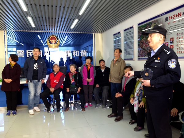 戚恩雨(右一)为辖区居民介绍安全知识。 同心路居委会供片