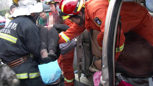 当日下午2时许,市消防支队文登大队接到报警,称在文登区泽库镇南岭村南环海路附近,一辆面包车撞在路边护栏上,车内副驾驶座上一女子被困。文登大队立即指令现代路消防中队赶赴现场救援。