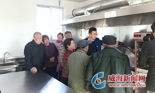 于翔宇(右二)给老人们介绍幸福院的厨房。 记者 初佳伦 摄