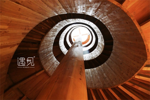 观光塔是纯木制,阳光从顶端洒下,旋转构造的楼梯多了几分意境。