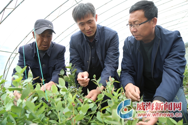 林强(中)正在蓝莓大棚查看长势。 记者 王彦博 摄
