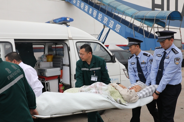 当日8时许,石岛出入境边防检查站接到华东海运公司的求助电话,称即将入境石岛的“华东明珠-8”号客货班轮上,有一名不慎摔伤骨折的老人,急需下船治疗,请求边检站提供通关便利。