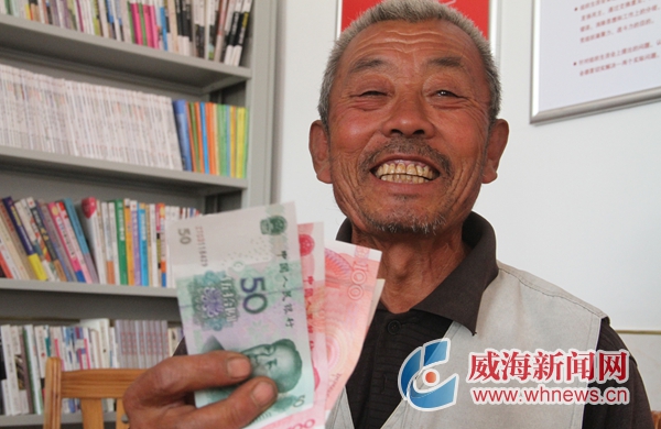 领到劳务工资后,这名村民很开心