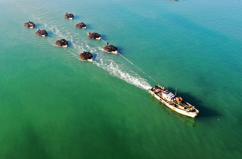 5月28日,在荣成市的海带养殖区里,工人满载海带驶向码头(无人机拍摄)。