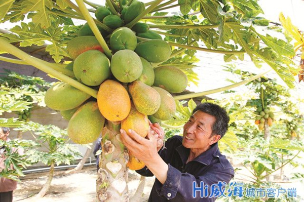 西山后村村民在摘取成熟木瓜