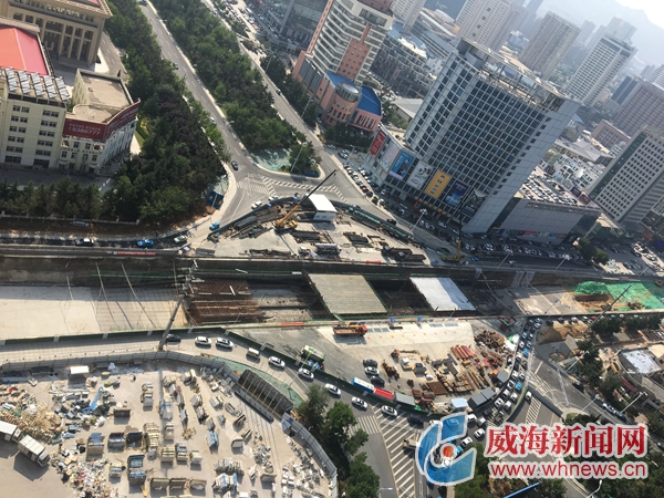 记者随后从乐天双子星向下望去,海滨南路-上海路环岛改造工程隧道雏形清晰可见。