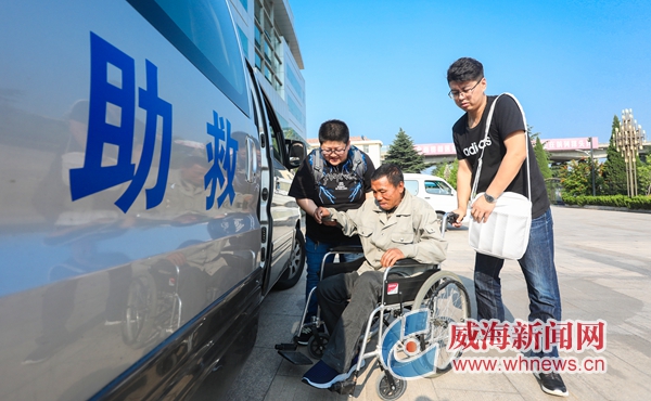 6月16日上午,在威海市救助站,工作人员启程将流浪至威海的老人全程看护送回内蒙古老家。