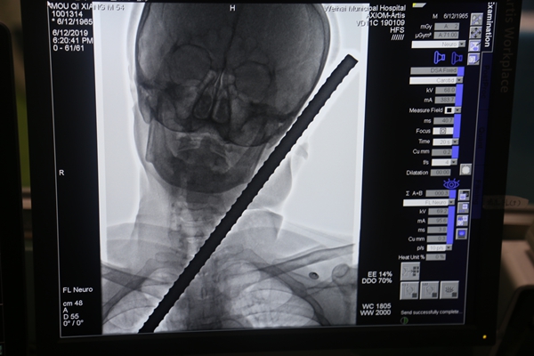 “如果断裂的颞浅动脉不能得到及时处理,在手术取钢筋时就会出血,那样不仅会给手术造成麻烦,而且对于伤者也比较危险。”威海市立医院介入放射科主任郭喜田说,伤者被送进介入手术室后,他们为伤者进行了颈部血管介入造影+栓塞止血术,这为下一步顺利开展异物取出手术做了充分的前期准备。