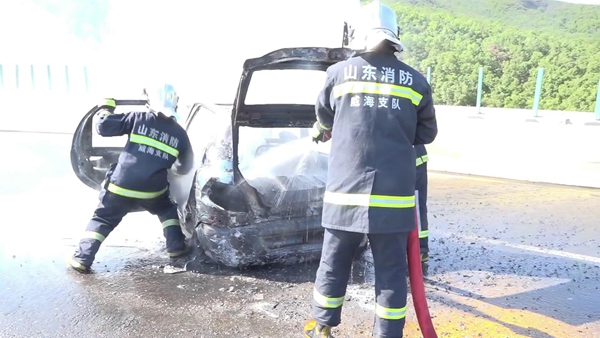 市消防119指挥中心接警后,立即调度临港区消防大队开元路中队前往救援。消防车载着消防员赶到现场后,很快将明火扑灭,但事故车辆已被烧成空壳。