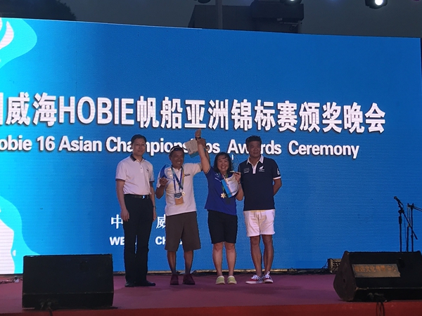 在颁奖晚会上,2019年中国威海HOBIE帆船亚洲锦标赛裁判长宣布了比赛最终成绩。来自12个国家和地区的32个代表队在3天时间里完成了11轮比赛,最终来自泰国的TEERAPONG WATIBOONRUANG、NUTPATSORN WACHIRAPONGSIN和KITSADA VONGTIM、NOPPORNBOONCHERD代表队分获前两名,来自香港的唐成、刘雪莹代表中国斩获第3名。在1至8名内,中国代表队斩获4席成最大赢家,泰国和比利时代表队分别占据3席和1席。在晚会现场,获得冠亚季军的3对选手分别上台领取了获奖证书和奖牌。