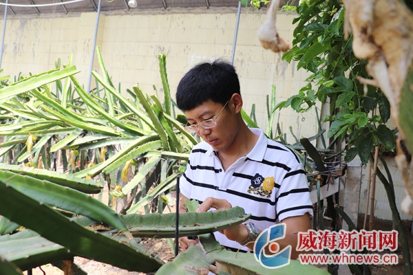 火龙果大棚内,经理吕卫伟每日穿梭在水泥方柱和绿色枝条之间,对每棵火龙果都照料有加:“剪掉这样的小枝芽,大果的营养才能不被分走,结出的果才够甜。”