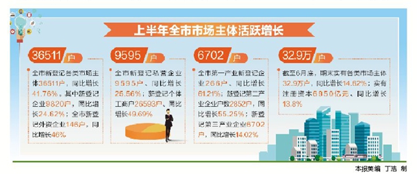 市场主体总量持续增长。上半年,全市新登记各类市场主体36511户,同比增长41.76%。其中新登记企业9820户,同比增长24.62%。截至6月底,期末实有各类市场主体32.9万户,同比增长14.62%;实有注册资本6950亿元、同比增长13.8%。