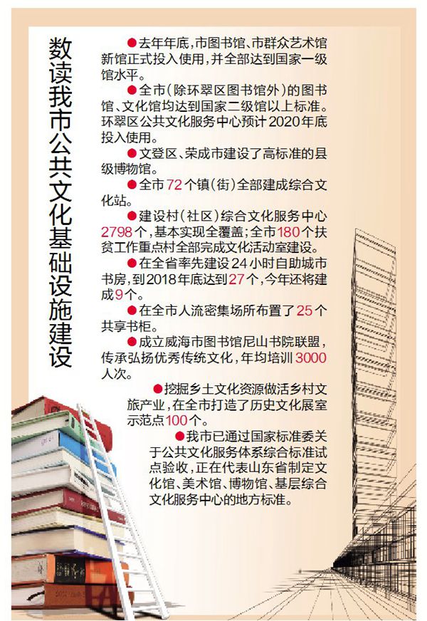 截至目前,全市(除环翠区图书馆外)的图书馆、文化馆均达到国家二级馆以上标准,文登区、荣成市建设了高标准的县级博物馆;全市72个镇(街)全部建成综合文化站,建设村(社区)综合文化服务中心2798个,基本实现全覆盖;全市180个省定扶贫工作重点村全部完成文化活动室建设。此外,我市还在全省率先建设24小时自助城市书房,到2018年底达到27个,今年还将建成9个;在全市人流密集场所布置了25个共享书柜,将便民阅读服务延伸至最后一公里。