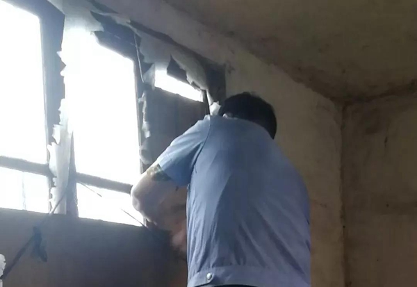民警帮助老人将被强台风破坏的窗户用木板封上。