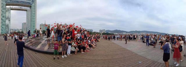 ▲8月10日在幸福门的拍摄现场,很多威海市民和游客自发参与进来,共同为祖国献礼。