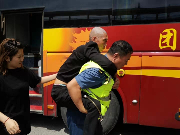 执法人员将违规客车上行动不便的老人背下车换乘。张鹏 摄