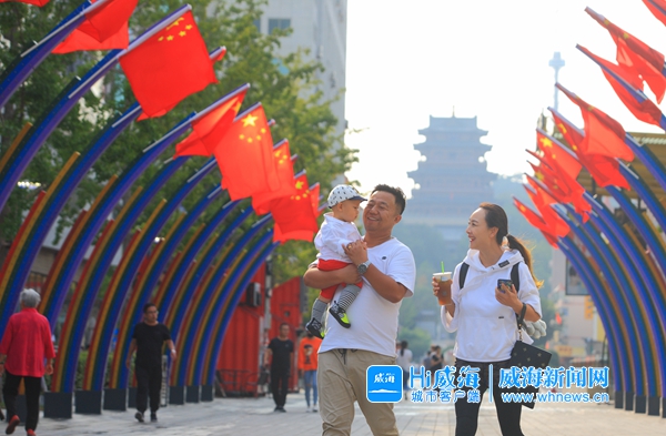 国庆节临近,市区大街小巷纷纷悬挂起国旗,在市区威高广场内街,一条挂满国旗的长廊成为亮丽的红色风景,吸引了不少市民、游客“打卡”拍照。