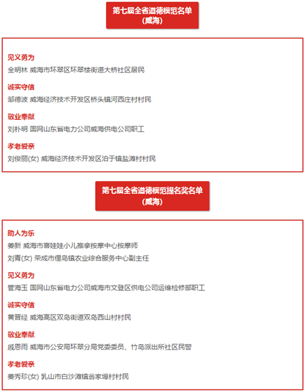 威海新闻网10月18日讯 10月17日,记者从全省道德模范座谈会上获悉,全省共有60人获第七届全省道德模范称号,126人获得全省道德模范提名奖。其中,我市全明林、邹德波、刘朴明、刘俊丽4人获评第七届全省道德模范称号,姜新、刘青、管海玉、黄晋经、戚恩雨、姜秀珍6人获得第七届全省道德模范提名奖。