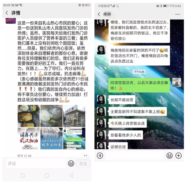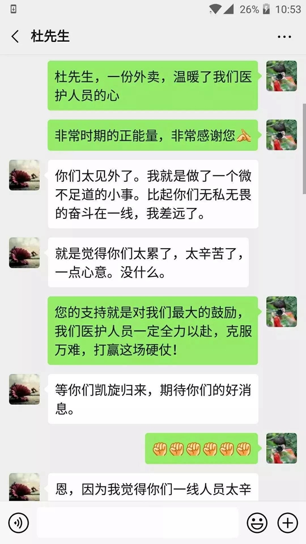 几经转折,最终电话联系到这位爱心人士。原来,这位爱心人士姓杜,祖籍乳山,在青岛工作,现回乳山老家过年。他在新闻里看到医护人员为抗击新型冠状病毒肺炎,日夜奋战,非常感动,就点了一份外卖表达自己的心意。杜先生说,“我就是做了一件微不足道的小事,比起你们无私无畏奋斗在临床一线,我差远了。以后有机会我给你们包饺子吃!”