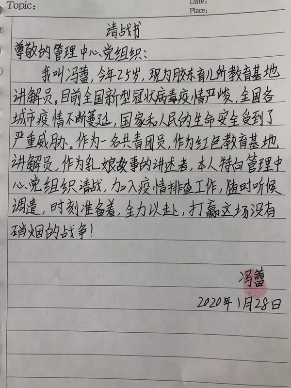 冯蕾,是威海马石山教育基地管理中心的一名讲解员。2020年1月28日,她给管理中心党组织递交了一份“请战书”。