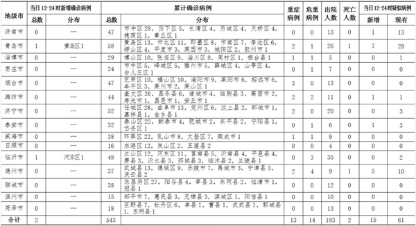 2020年2月17日12-24时,山东省报告新增新型冠状病毒肺炎确诊病例2例,累计确诊病例543例(含重症病例13例,危重症病例14例,治愈出院193例,死亡病例2例);新增疑似病例15例,现有疑似病例61例。截至目前,追踪到密切接触者15909人,已解除医学观察12650人,诊断为疑似或确诊病例289例,尚有2970人正在接受医学观察。