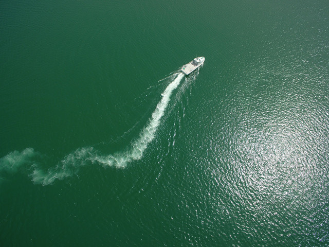 威海天航信息技术有限公司研发的精灵4航拍的无人艇在海中疾驰画面