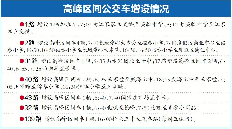 “33路增加区间车次运行的车辆为高峰区间车,王家村至北竹岛、长峰至凤林集各运行一辆,3个车次,单程载客,返程不载客。”工作人员介绍,这两个区域内早高峰的客流非常集中,此前在早高峰时段,33路全程运行会因为道路拥堵而延长运行时间,现在增加高峰区间车的好处是能够迅速疏运早高峰时段的客流。