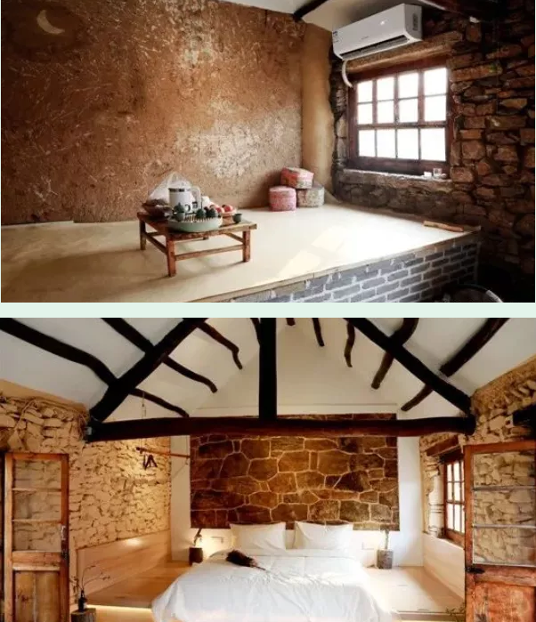 穿堂过屋,来到卧室,屋内各处均被精细装修过,老旧石墙被粉刷成暖黄色,壁炉、躺椅、榻榻米、沙发床垫等的摆设,让这里有些小资情趣。