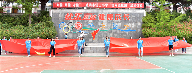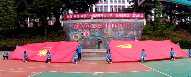 传承红色经典,树立诚信之风。在启动仪式上,国旗、党旗、队旗三旗传递,在庄严的红旗下,威海市塔山小学校长王黎明对“诚信进校园”工作做动员讲话。她强调了诚信建设对于教师职业道德教育和学生思政教育具有深远的意义,并指出:“全体师生都是诚信教育的主人公,深入组织少先队员开展‘四个一’等丰富多彩的诚信教育活动,以学生‘真爱诚信美德银行’、教师‘个人诚信建设’两大校园工程为抓手,将诚信教育落实到教师队伍建设和学生培养过程中,号召‘小手拉大手,诚信一起走’,家校联盟、社区联动,打造家庭、学校、社会的信用同心圆,践行社会主义核心价值观,争做时代担当的好公民。”