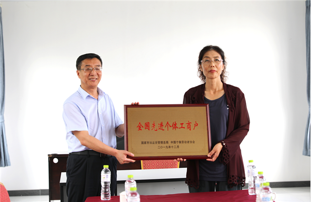 7月7日,威海市市场监管局举办“全国先进个体工商户”授牌仪式,市市场监管局工作人员将“全国先进个体工商户”奖牌授予戚秀丽。