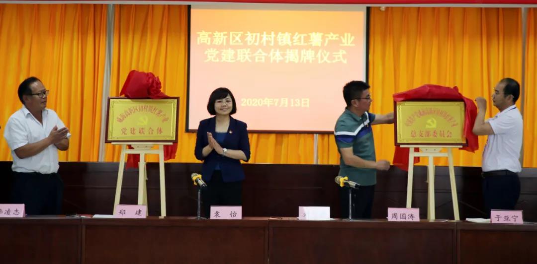 高新区工委组织部、初村镇党委、蓝呱呱农业科技公司等相关负责人,为初村镇红薯产业党建联合体、红薯产业党总支揭牌。初村镇红薯产业党总支书记介绍了党建联合体成立背景、运转机制和下步打算。红薯产业党建联合体以蓝呱呱农业科技公司为依托,以日本“红春香”红薯产业为纽带,吸纳有共同产业基础的5个村参与,定期召开联席会议,负责协调发展订单农业、融入红薯加工业等工作,实行组织联建、产业联育、治理联抓,构建紧密发展共同体,推动合作共赢、整体提升。