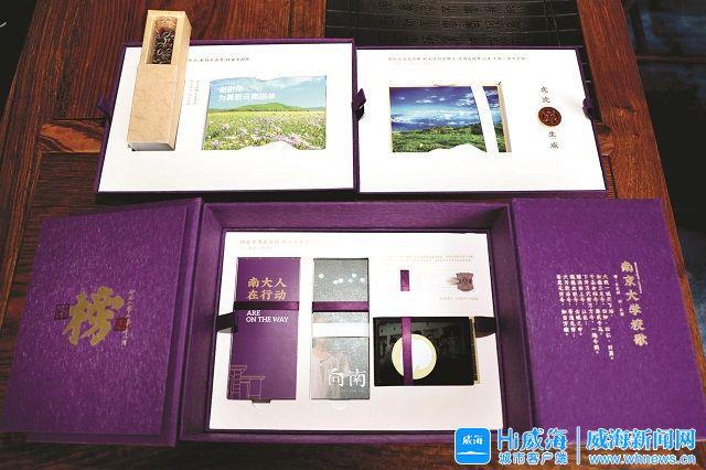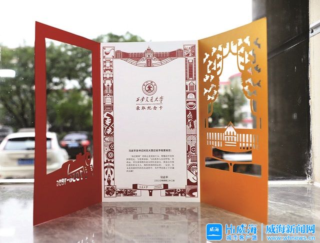 西安交通大学的录取通知书,整体采用3折页内嵌形式,外层封套为录取纪念卡。纪念卡封面为带有“1956年”字样的西迁专列,封二为西安交大中心楼与梧桐树,制作工艺包括激光雕刻、人工复核、拼插组合、凹印等特殊工艺,体现西安交大人的匠心精神。(Hi威海客户端实习记者 宋佳佳/文 记者 姚威/图)