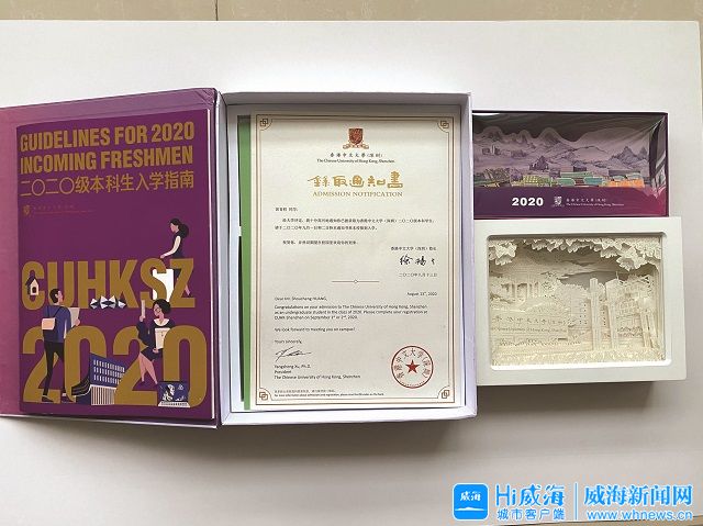 准大学生黄首程介绍,香港中文大学(深圳)录取通知书纸张采用质感满满的特种纸,“录取通知书”字样及大学logo均采用烫金工艺,配上徐扬生校长书法和中英对照的内容,完美体现了大学“结合传统与现代,融会中国与西方”的办学使命。