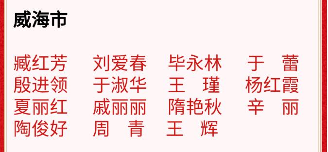 11月18日,山东省妇联印发《关于表彰山东省三八红旗手标兵、山东省三八红旗手、山东省三八红旗集体的决定》,授予10名同志山东省三八红旗手标兵称号,授予340名同志山东省三八红旗手称号,授予350个单位山东省三八红旗集体称号,其中,威海有15人获得山东省三八红旗手称号称号,14个单位获得山东省三八红旗集体称号。